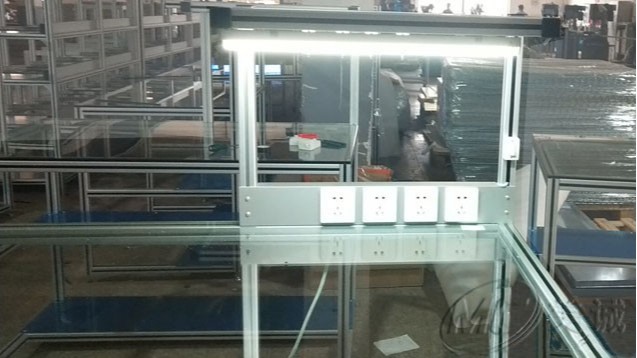 鋼化玻璃操作臺由專用工業(yè)鋁型材作為框架,其需求根據(jù)客戶制定進行免費設(shè)計、切割加工,配件連接而組成,其中運用了鋼化玻璃作為臺面,裝有照明日光燈,以及電源插座方便實際工作中的操作,提高工作效能。
